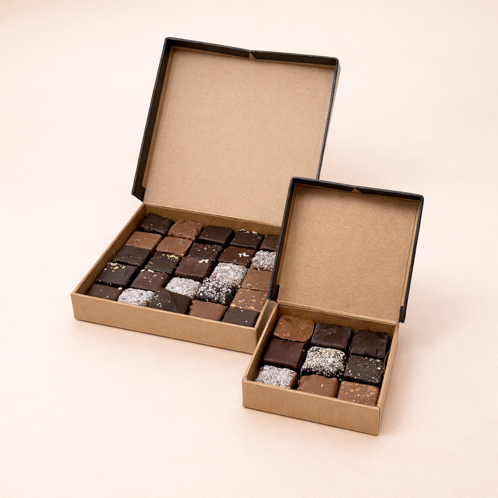 Le Coffret Initiation vous propose un assortiment de 25 bonbons de chocolat ganache et praliné parmi les saveurs suivantes :
