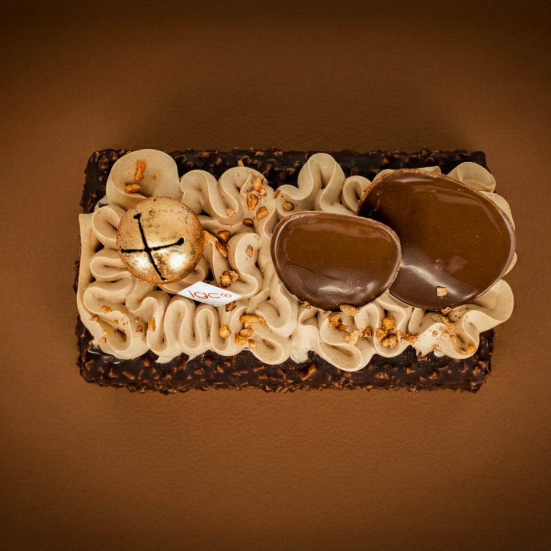 Un croustillant praliné noisette, un biscuit chocolat parsemé d’éclats, un crémeux noisette fondant et une mousse chocolat noir, le tout sublimé par une ganache montée au lait.