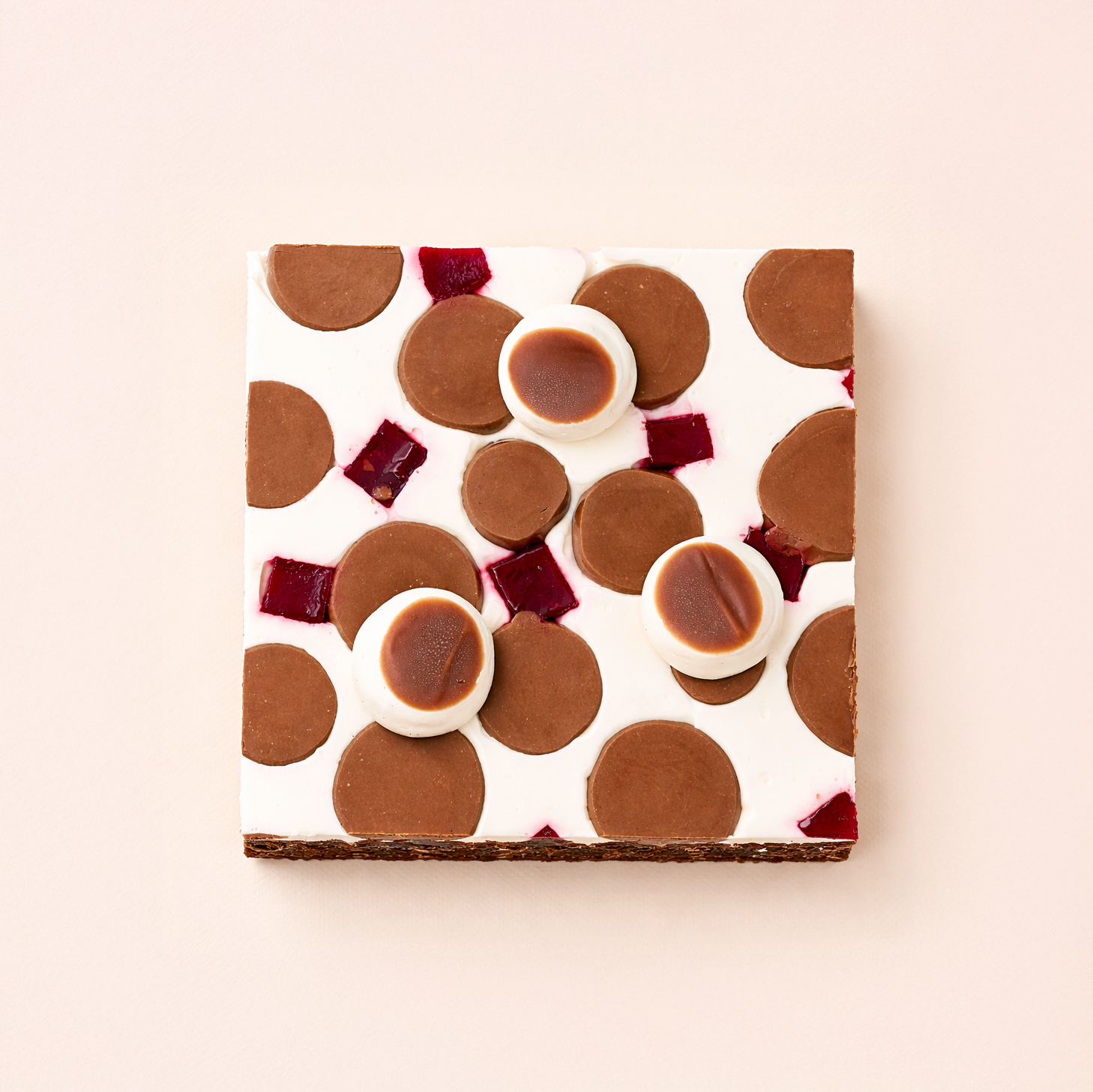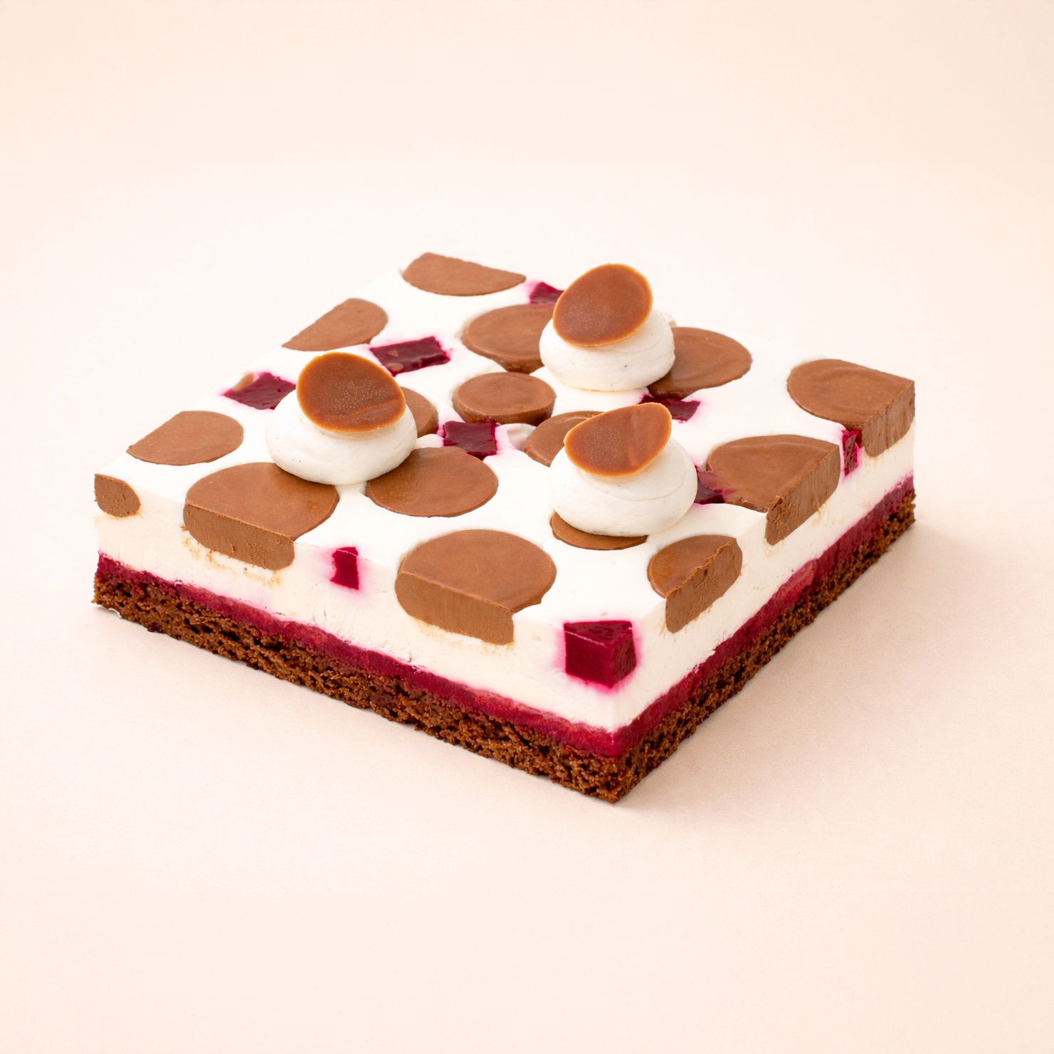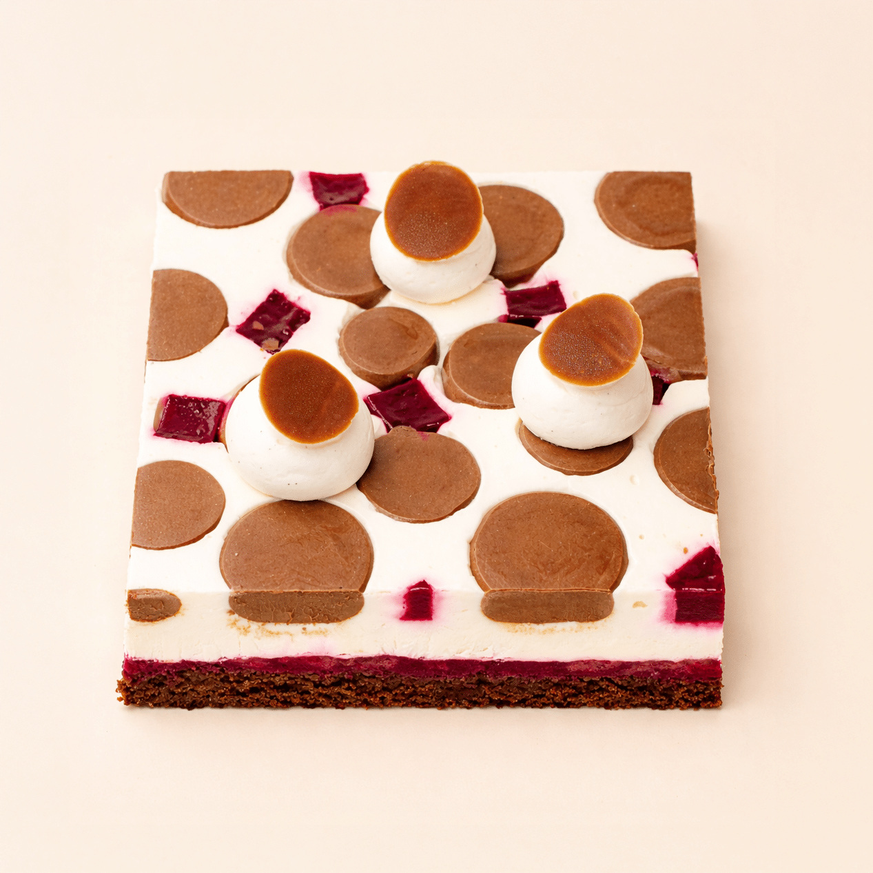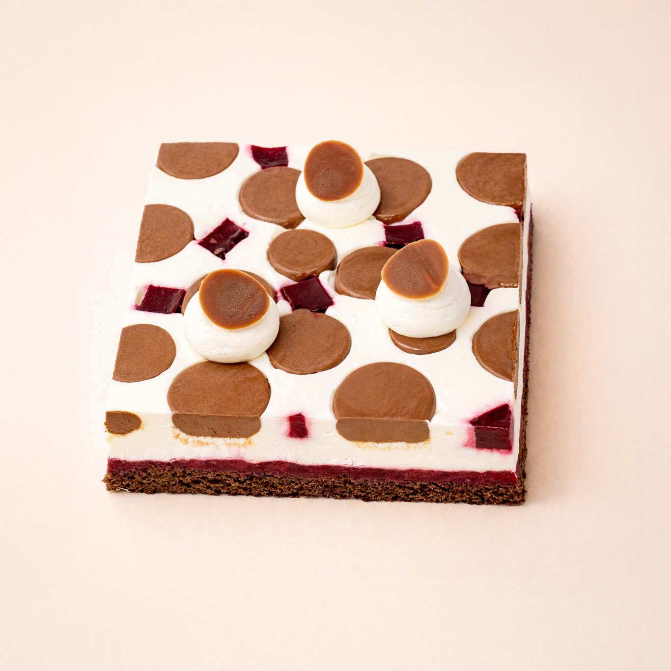 Biscuit cake chocolat, crémeux chocolat noir 70%, confit griotte, insert griotte, ganache montée chocolat blanc.