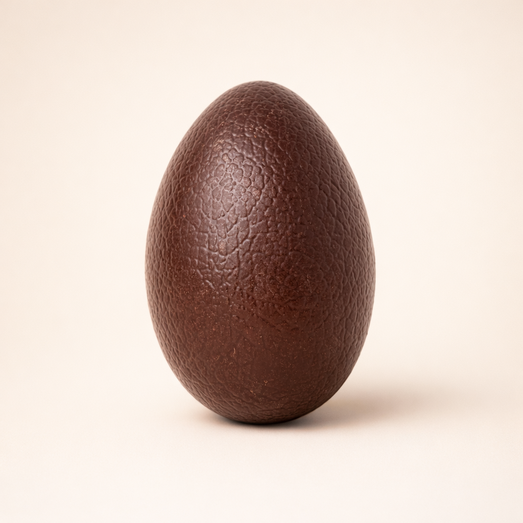 Œuf texturé en chocolat noir 70% avec fritures et petits œufs praliné noir à l’intérieur.