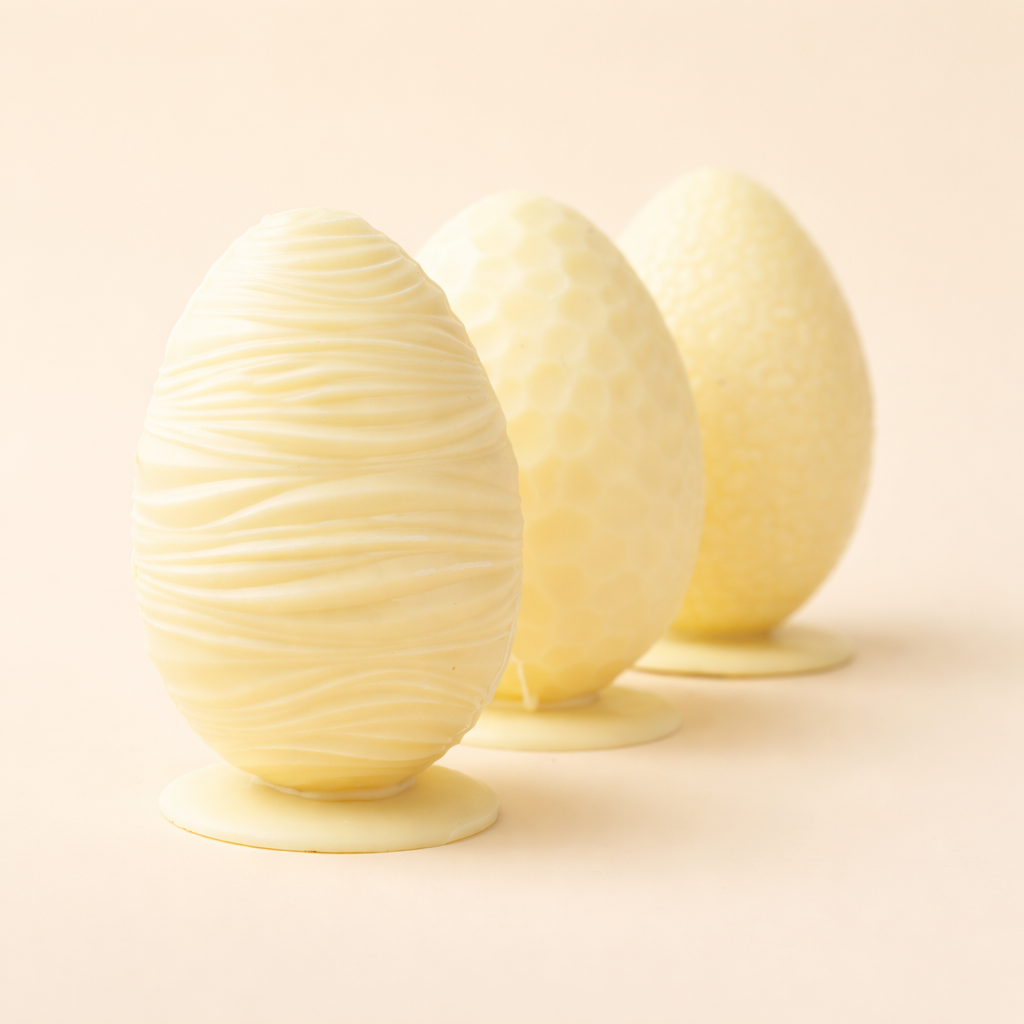 Œuf en chocolat blanc 36% avec friture à l’intérieur.